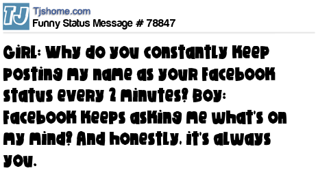 X is Girl: Why do you constantly keep posting my name as your Facebook status every 2 minutes? Boy: Facebook keeps asking me what's on my mind? And honestly, it's always you.