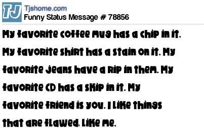 X My favorite coffee mug has a chip in it. My favorite shirt has a stain on it. My favorite jeans have a rip in them. My favorite CD has a skip in it. My favorite friend is you. I like things that are flawed, like me.