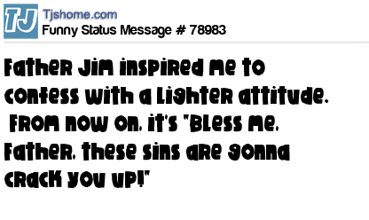 X Father Jim inspired me to confess with a lighter attitude. From now on, it's "Bless me, Father, these sins are gonna crack you up!"