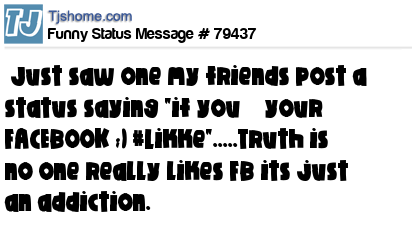 X says Just saw one my friends post a status saying "if you ♥ your FACEBOOK ;) #Likke".....Truth is no one really likes FB its just an addiction.