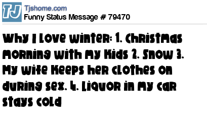 X Why I love winter: 1. Christmas morning with my kids 2. Snow 3. My wife keeps her clothes on during sex. 4. Liquor in my car stays cold