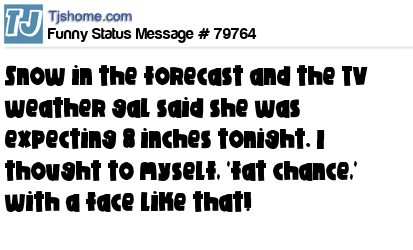 X is Snow in the forecast and the TV weather gal said she was expecting 8 inches tonight. I thought to myself, 'fat chance,' with a face like that!