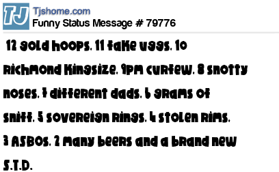 X is 12 gold hoops, 11 fake uggs, 10 richmond kingsize, 9pm curfew, 8 snotty noses, 7 different dads, 6 grams of sniff, 5 sovereign rings, 4 stolen rims, 3 ASBOs, 2 many beers and a brand new S.T.D.