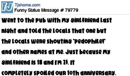 X Went to the pub with my girlfriend last night and told the locals that one but the locals were shouting "pedophile!" and other names at me, just because my girlfriend is 18 and I'm 27. It completely spoiled our 10th anniversary.