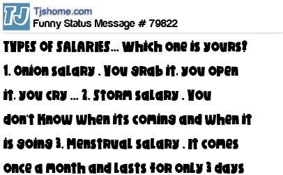 X is TYPES OF SALARIES... Which one is yours? 1. Onion salary . You grab it, you open it, you cry ... 2. Storm salary . You don't know when its coming and when it is going 3. Menstrual salary . It comes once a month and lasts for only 3 days 4. Magic salary .