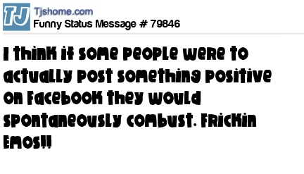 X I think if some people were to actually post something positive on Facebook they would spontaneously combust. Frickin Emos!!
