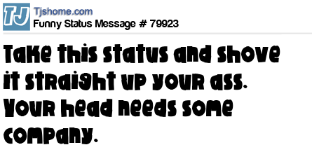 X Take this status and shove it straight up your ass. Your head needs some company.
