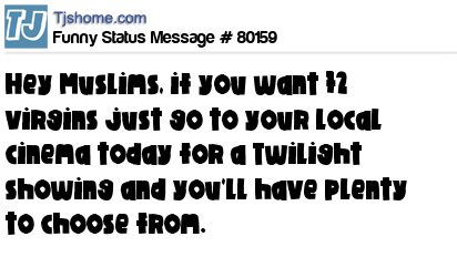 X Hey Muslims, if you want 72 virgins just go to your local cinema today for a Twilight showing and you'll have plenty to choose from.