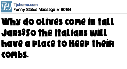 X  Why do olives come in tall jars?So the Italians will have a place to keep their combs.