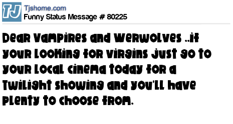 - # 80159 Hey Muslims, if you want 72 virgins just go to your local cinema today for a Twilight showing and you'll have plenty to choose from.