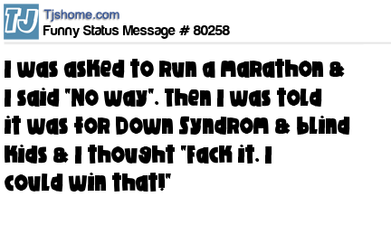 X I was asked to run a marathon & I said "No way". Then I was told it was for Down Syndrom & blind kids & I thought "Fack it. I could win that!"
