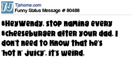 X #HeyWendy, stop naming every #cheeseburger after your dad. I don't need to know that he's 'hot n' juicy', it's weird.