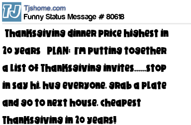 X “Thanksgiving dinner price highest in 20 years” PLAN: I'm putting together a list of Thanksgiving invites......stop in say hi, hug everyone, grab a plate and go to next house, cheapest Thanksgiving in 20 years!