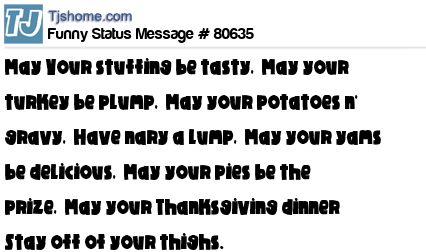 - # 9920 May your stuffing be tasty, may your turkey be plump, may your potatoes and gravy have a nary lump. May your yams be delicious, And your pies take the prize, and may your Thanksgiving dinner stay off your thighs! HAPPY THANKSGIVING ALL..........