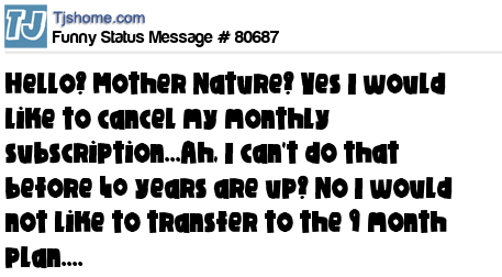 - # 160280 Instead of getting periods, can girls just get a text once a month from mother nature saying "You're not pregnant, have a nice day!"