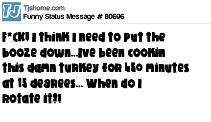 X is F*CK! I think I need to put the booze down...Ive been cookin this damn turkey for 450 minutes at 15 degrees... When do I rotate it?!