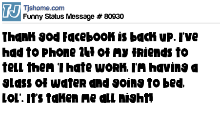 X Thank god Facebook is back up. I've had to phone 247 of my friends to tell them 'I hate work, I'm having a glass of water and going to bed, lol'. It's taken me all night!