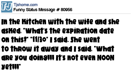 X was In the kitchen with the wife and she asked, "What's the expiration date on this?" "11/30" I said. She went to throw it away and I said, "What are you doing!!! It's not even NOON yet!!!"