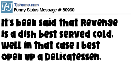 - # 183526 While thinking of revenge two sayings came to mind: " revenge is a dish best served cold" and "revenge is sweet". I therefore came to the conclusion that revenge is ice cream.