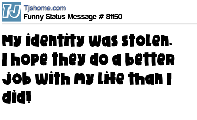 - # 85429 I had my identity stolen the day after Christmas. It was reurned in yesterday's mail with $20 and a note that read, "Damn dude, no one owants to be you!"