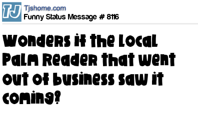 - # 70382 To the lady who ready my palm at the county fair in the summer of '99. The one who told me I would be married, have two kids, and own a business when I got older. I wish my divorced $7.76/hr ass could talk to you again!!