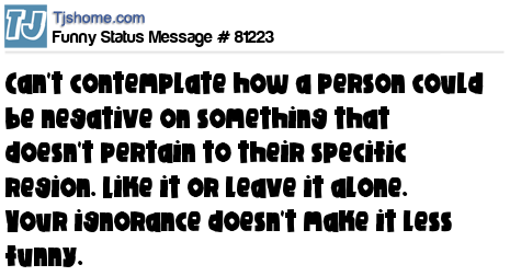 X  Can't contemplate how a person could be negative on something that doesn't pertain to their specific region. Like it or leave it alone. Your ignorance doesn't make it less funny.