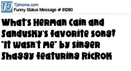X is What's Herman Cain and Sandusky's favorite song? "It wasn't me" by singer Shaggy featuring RicRok