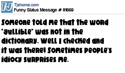 X is Someone told me that the word "gullible" was not in the dictionary. Well I checked and it was there! Sometimes people's idiocy surprises me.