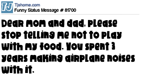- # 58744 Dear mom, Please stop telling me not to play with my food. You spent the first 2 years of my life pretending it was an airplane.