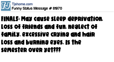 X is FINALS: May cause sleep deprivation, loss of friends and fun, neglect of family, excessive crying and hair loss and burning eyes. Is the semester over yet???