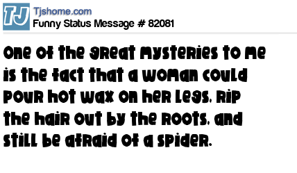 - # 31925 One of the great mysteries to me is the fact that us women can pour hot wax on our legs, rip the hair out by the roots, and still be afraid of a spider.
