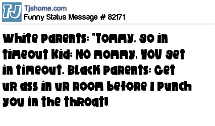 X is White parents: "Tommy, go in timeout Kid: NO mommy, YOU get in timeout. Black parents: Get ur ass in ur room before I punch you in the throat!