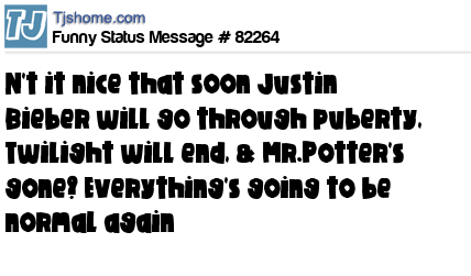 X n't it nice that soon Justin Bieber will go through puberty, Twilight will end, & Mr.Potter's gone? Everything's going to be normal again