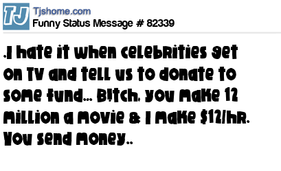 - # 82338 I hate it when celebrities get on TV and tell us to donate to some fund… B!tch, you make 12 million a movie & I make $12/hr. You send money.