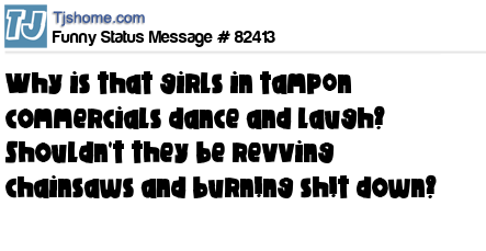 - # 109675 Why is it that girls in tampon commercials laugh and dance ? shouldn't they be revving chainsaws and burning shit down