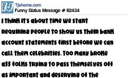 X says I think it's about time we start requiring people to show us their bank account statements first before we can call them celebrities. Too many broke a$$ folks trying to pass themselves off as important and deserving of the celebrity status.
