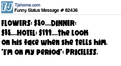 - # 3138 text from a female: "Flowers- 20. Dinner-50. Drinks- 25. Hotel- 150. The look on his face when I tell him I'm on my period? Priceless."