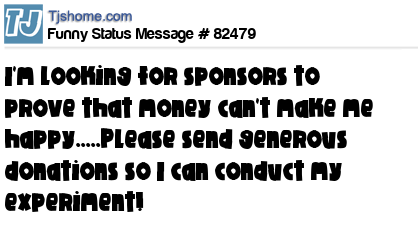 X I'm looking for sponsors to prove that money can't make me happy.....Please send generous donations so I can conduct my experiment! ツ