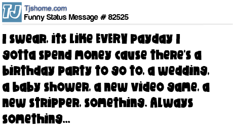X I swear, its like EVERY payday I gotta spend money cause there's a birthday party to go to, a wedding, a baby shower, a new video game, a new stripper, something. Always something...