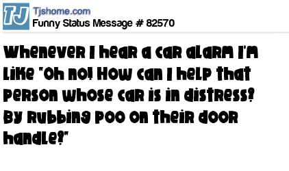 X Whenever I hear a car alarm I'm like "Oh no! How can I help that person whose car is in distress? By rubbing poo on their door handle?"
