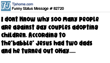 X I dont know why soo many people are against gay couples adopting children. According to the"babble" Jesus had two dads and he turned out okay.....