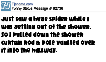 X says Just saw a huge spider while I was getting out of the shower. So I pulled down the shower curtain rod & pole vaulted over it into the hallway.