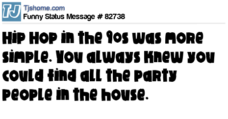 - # 67900 Went to a Real life party and I knew everybody there. Went to a Facebook party and saw most of my friends. Went to a Twitter party and didn't know anybody there. Went to a Myspace party and I was the only one there.