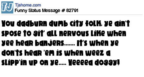 X You dadburn dumb city folk, ye ain't spose to git' all nervous like when yee hear banjers....... It's when ye don'ts hear 'em is when weez a slipp'in up on ye..... Yeeeea doggy!