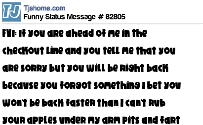 X FYI: If you are ahead of me in the checkout line and you tell me that you are sorry but you will be right back because you forgot something I bet you won't be back faster than I can't rub your apples under my arm pits and fart on your french bread.