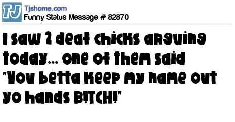 X says I saw 2 deaf chicks arguing today... one of them said "You betta keep my name out yo hands B!TCH!"