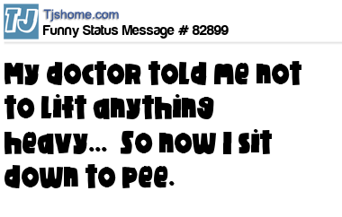 - # 94987 My doctor told me not to lift anything heavy for a few weeks. So I have to sit when I pee now.