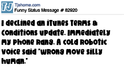 X says I declined an iTunes Terms & Conditions update. Immediately my phone rang. A cold robotic voice said "wrong move silly human."