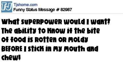 X What superpower would I want? The ability to know if the bite of food is rotten or moldy BEFORE I stick in my mouth and chew!