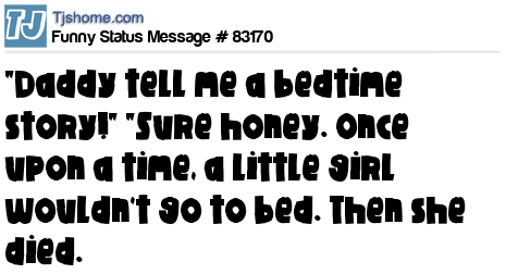 X is "Daddy tell me a bedtime story!" "Sure honey. Once upon a time, a little girl wouldn't go to bed. Then she died.